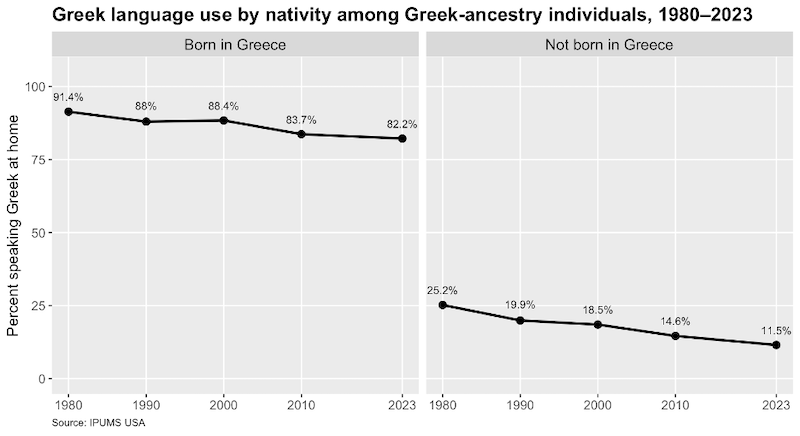 Greek Language Use by Nativity among Greek-Ancestry Individuals, 1980–2023