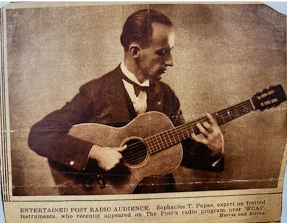 One of the popular young men in Washington today and prominent in the Capitol’s music circles is Sophocles T. Papas, teacher, and artist of fretted instruments. He has established a large studio in the exclusive section of the city and numbers many dignitaries among his pupils. He is instructor for fretted instruments at the National Park Seminary, an exclusive school for girls, which is one of the few schools to include the study of banjo, mandolin, and guitar in their regular course. Mr. Papas is also a faculty member of the Hendly-Kaspar School of Musical Art; he has also a wide reputation as a broadcasting soloist (Danner 1998, 32).